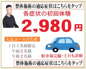 | 予約 | 当院は完全予約制の整体院です。ご予約の上、ご来院ください |